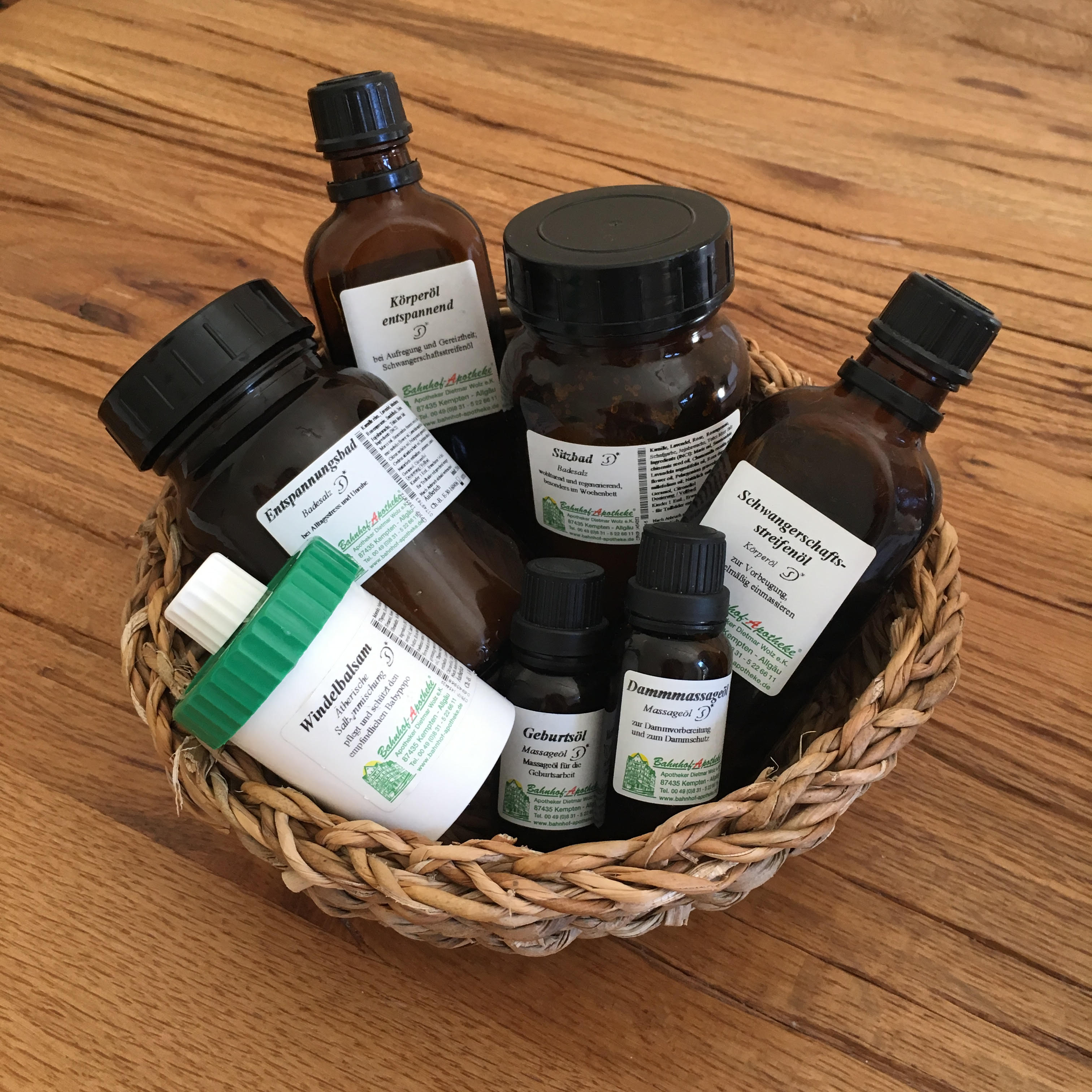 Folgende Produkte kann ich empfehlen (Anwendung im Buch ‚Die Hebammensprechstunde genauer beschrieben): Schwangerschaftsstreifenöl, Schwangerschaftstee, Dammmassageöl, Heublumen für Dampfsitzbad, Himbeerblättertee, Geburtsöl, Entbindungsduft, Wöchnerinnentee, Wochenbettbauchmassageöl, Sitzbad, Brustpflegecreme, Frauenmanteltee, Stillöl, Stilltee, Zahnöl und Windelbalsam
