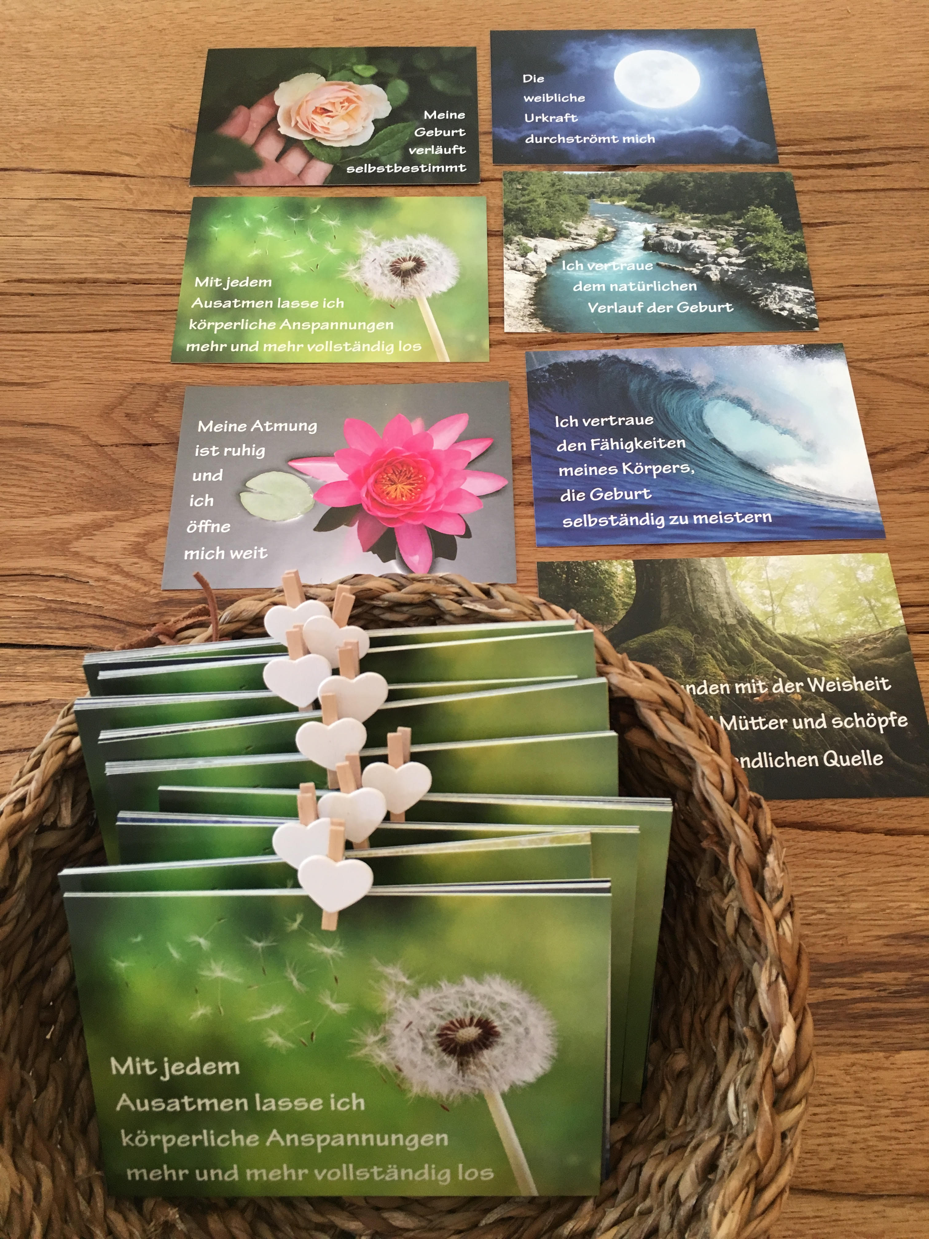 Sieben wunderschöne und starke Affirmationskarten habe ich selbst kreiert und verschenke diese seit jeher an Schwangere, die sich bewusst auf ihre Geburt vorbereiten möchten. Affirmationskarten sind eine gute Unterstützung bei der Geburtsvorbereitung und der Geburt selbst. Um dieses Kartenset zu erhalten, bitte ich dich um Folgendes: